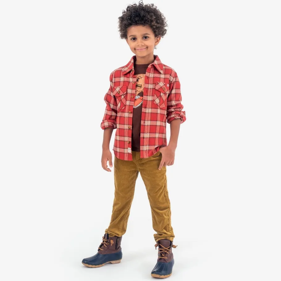 The Flannel Shirt in Bossa Nova Plaid features a vibrant orange hues with a stylish blue elbow patching. It has two pockets in the front and easy-to-use buttons. Perfect for chilly fall days, this shirt will keep your little one warm and comfortable while looking effortlessly cool.