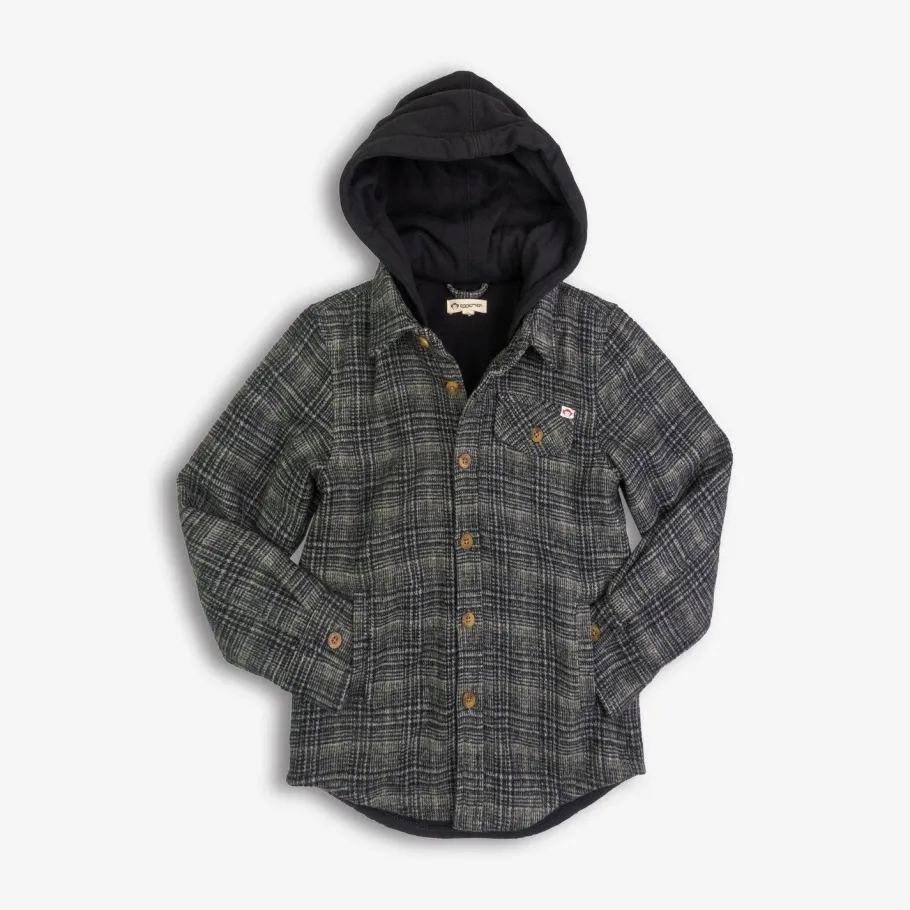 Stay cozy in style with our Black/Moss Plaid Glen Hooded Shirt. Featuring a classic black hoodie attached to a moss-plaid flannel shirt, this button-up design offers comfort and versatility. Complete with front pockets, it’s relaxed for any adventure your little one goes on.