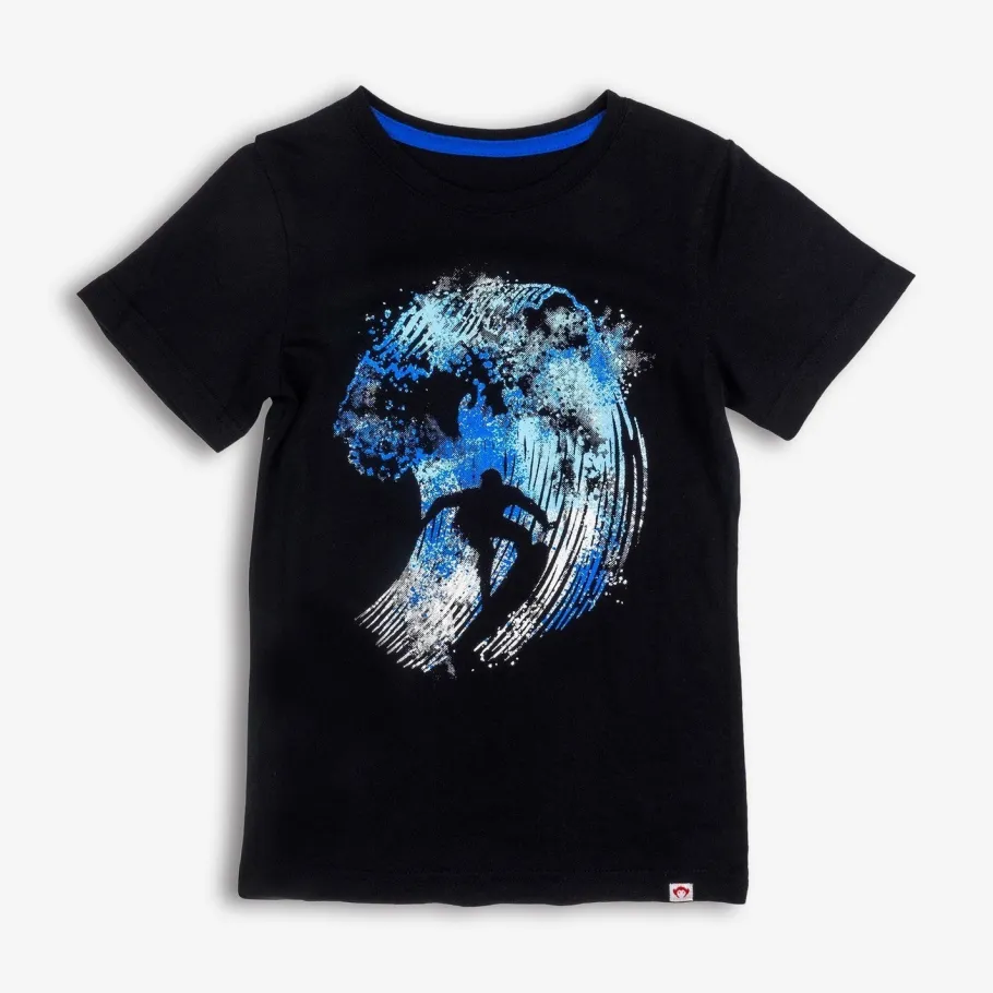 This short-sleeve graphic shirt is 100% cotton and features a cool surfer tackling massive blue waves – because conque…