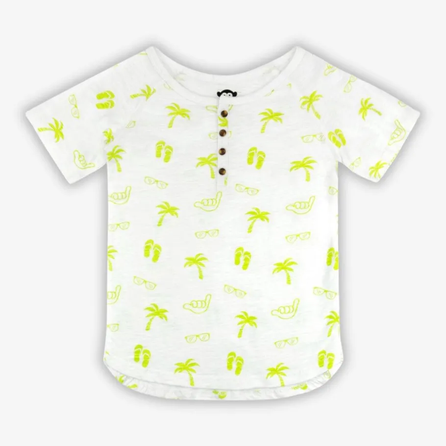 Grab some sandals, find a coconut tree and show us your shaka! This fun print Henley tee is bound to make your summer sp…