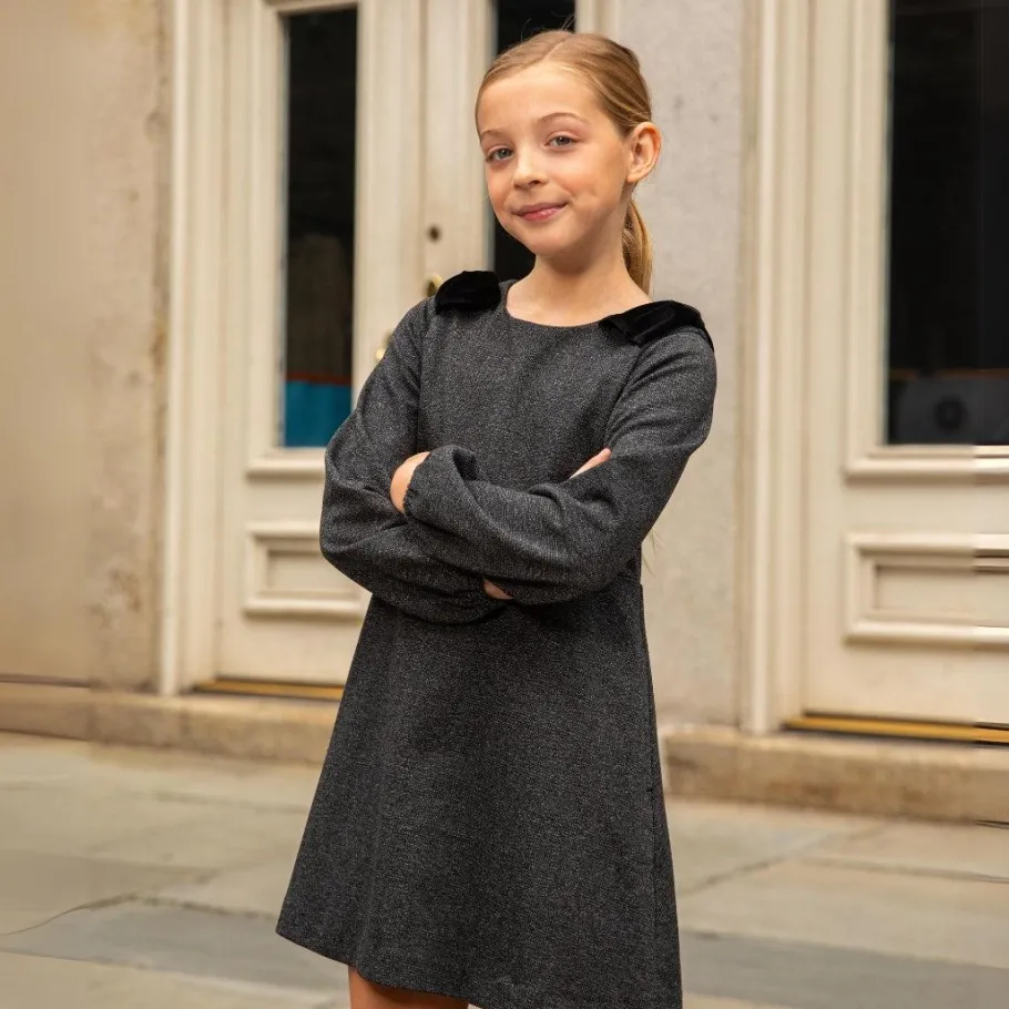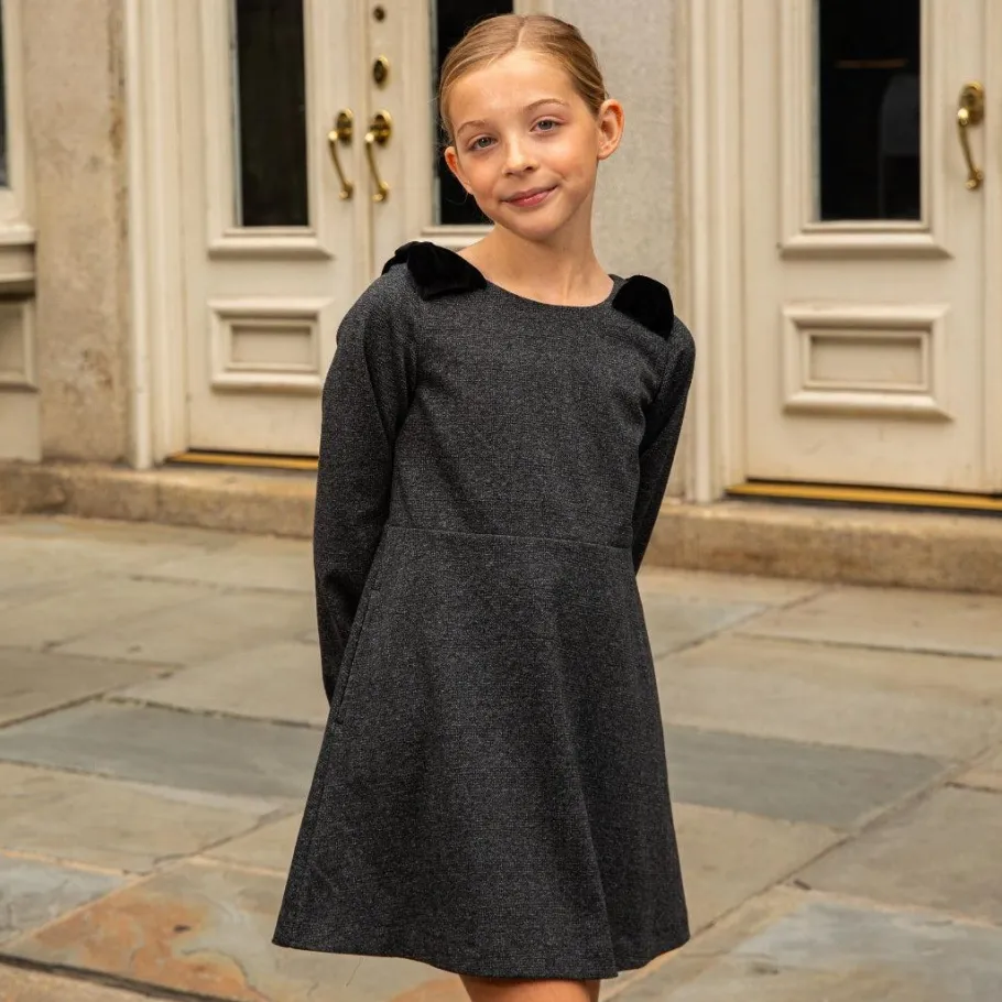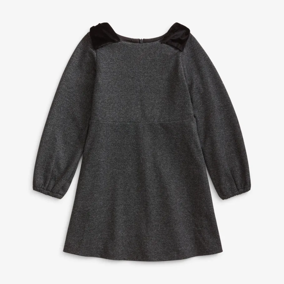 Our newest, web-exclusive sweater dress will be your girl’s go-to item for when temperatures drop. Featuring a beautiful textured micro plaid stitch, flattering A-line silhouette, sweet oversized bows at the decorative shoulders, and elegant oversized long-sleeve detailing. This dress works for all occasions!