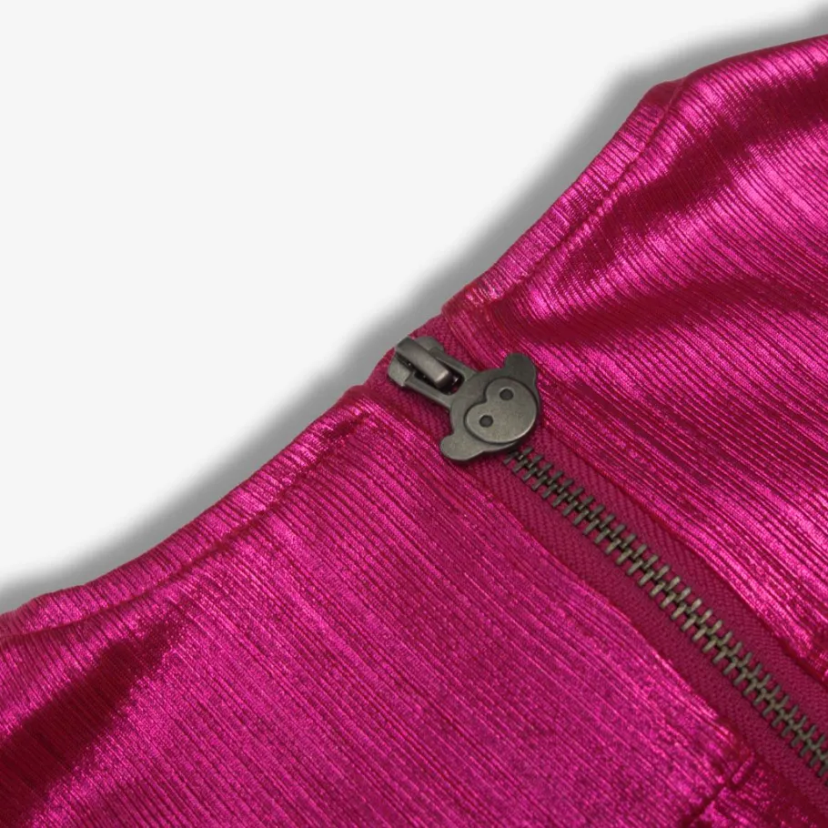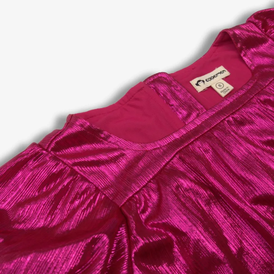 Make a statement in this vibrant fuchsia-colored dress, boasting a shiny finish, playful puff sleeves, and a chic square neckline.