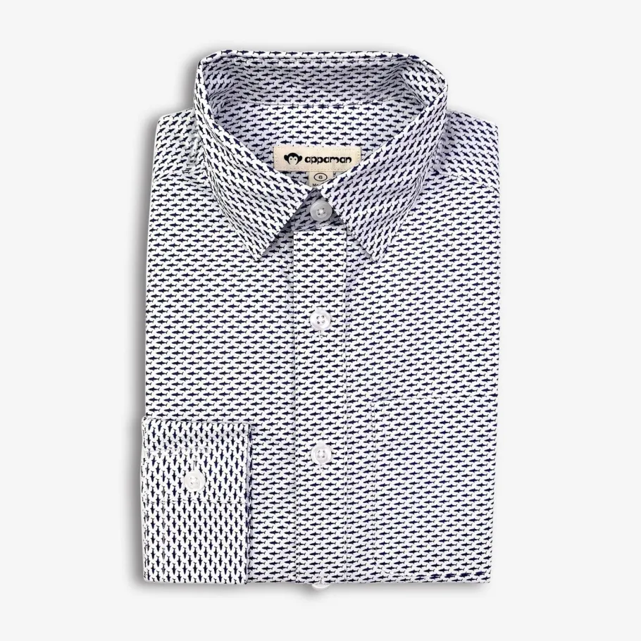 Detailed in a navy blue shark print, this 100% cotton dress shirt features a button-down collar and long sleeves.
