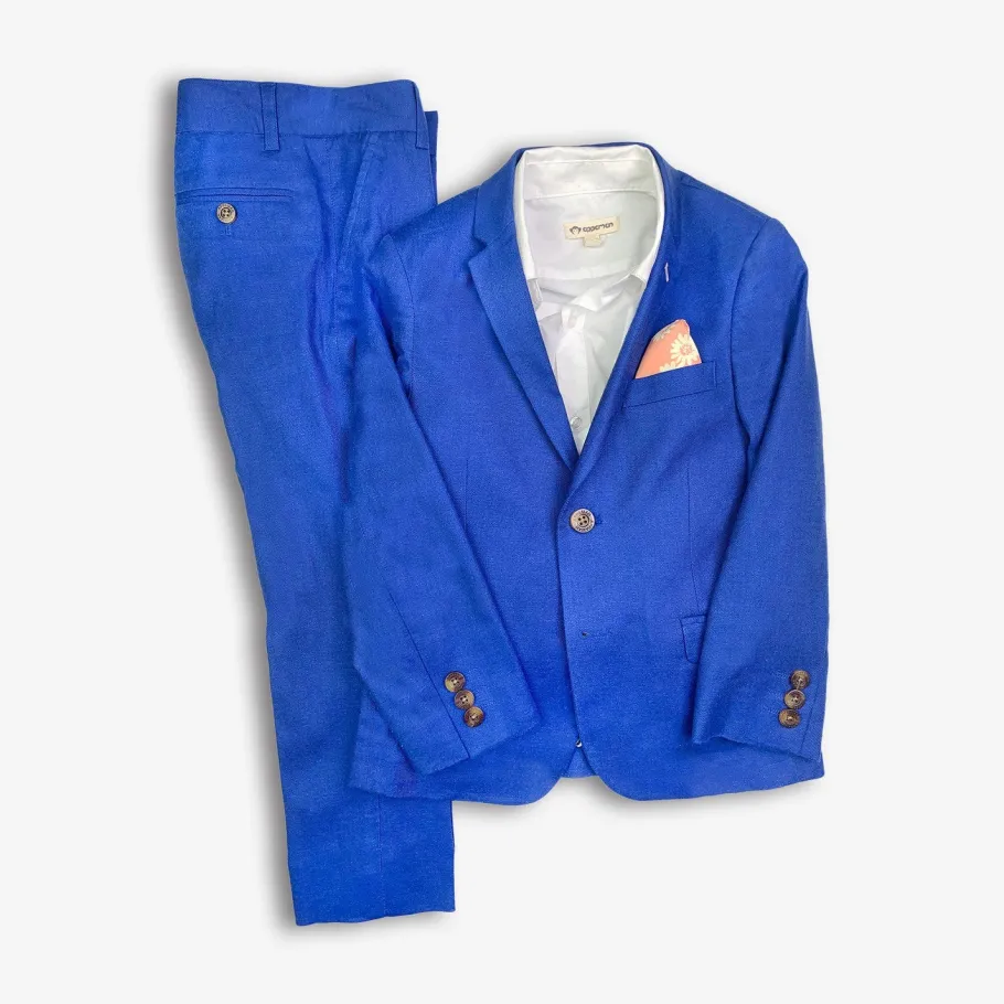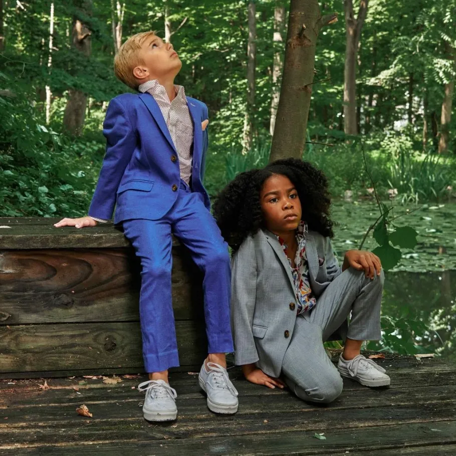 Our classic two-piece modern stretch linen-blend suit features a notch-lapel blazer and adjustable waist and hem pants for your little one to wear as they grow! Bonus: It features an attached, contrast pocket square that can be popped out, or tucked in. Premium White Standard Shirt sold separate.