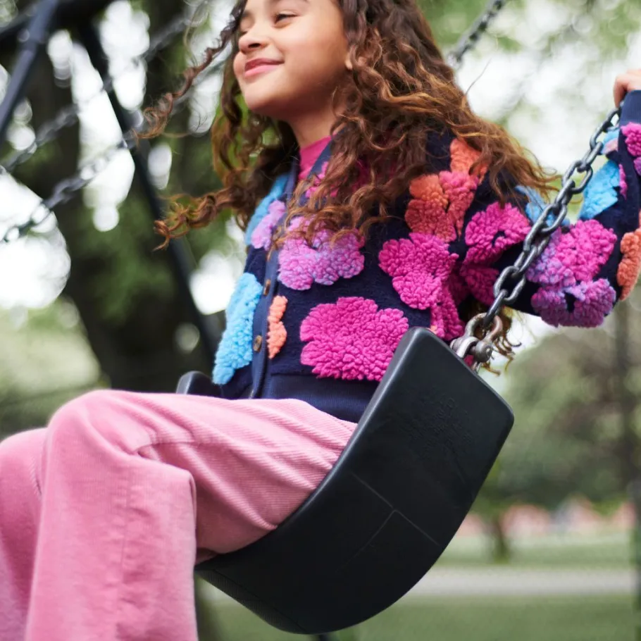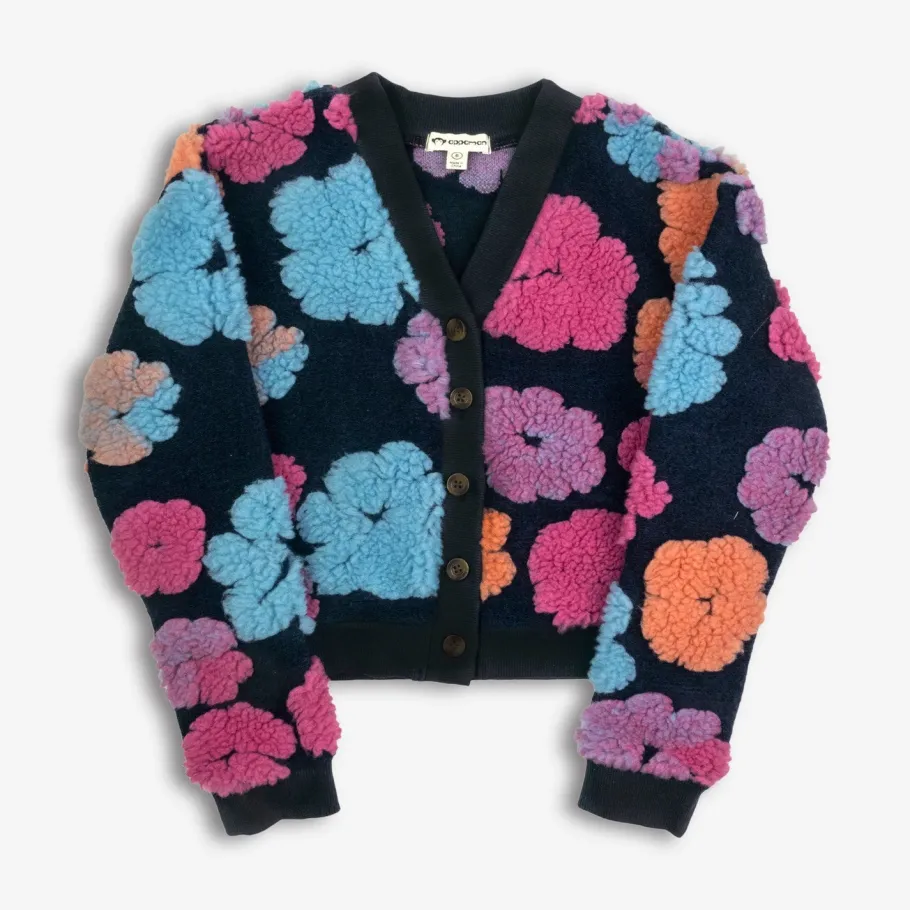 Introducing our Girls’ Raya Cardigan Set, a cozy black layer adorned with a pink undershirt and vibrant fuzzy flowers in pink, blue, and orange. Crafted for comfort and style, it adds a playful touch to any outfit. Perfect for a statement-style piece.