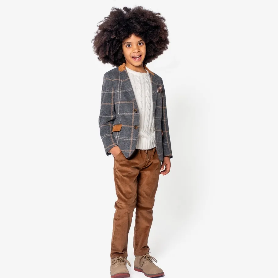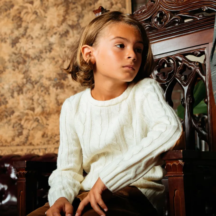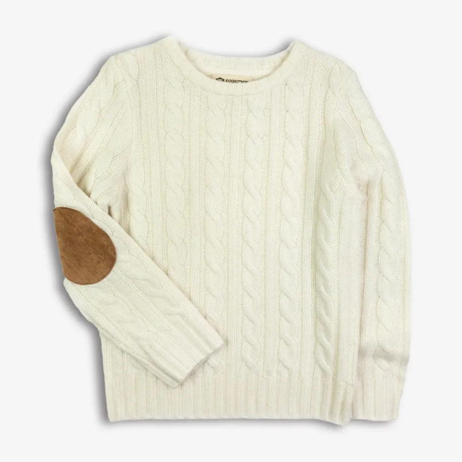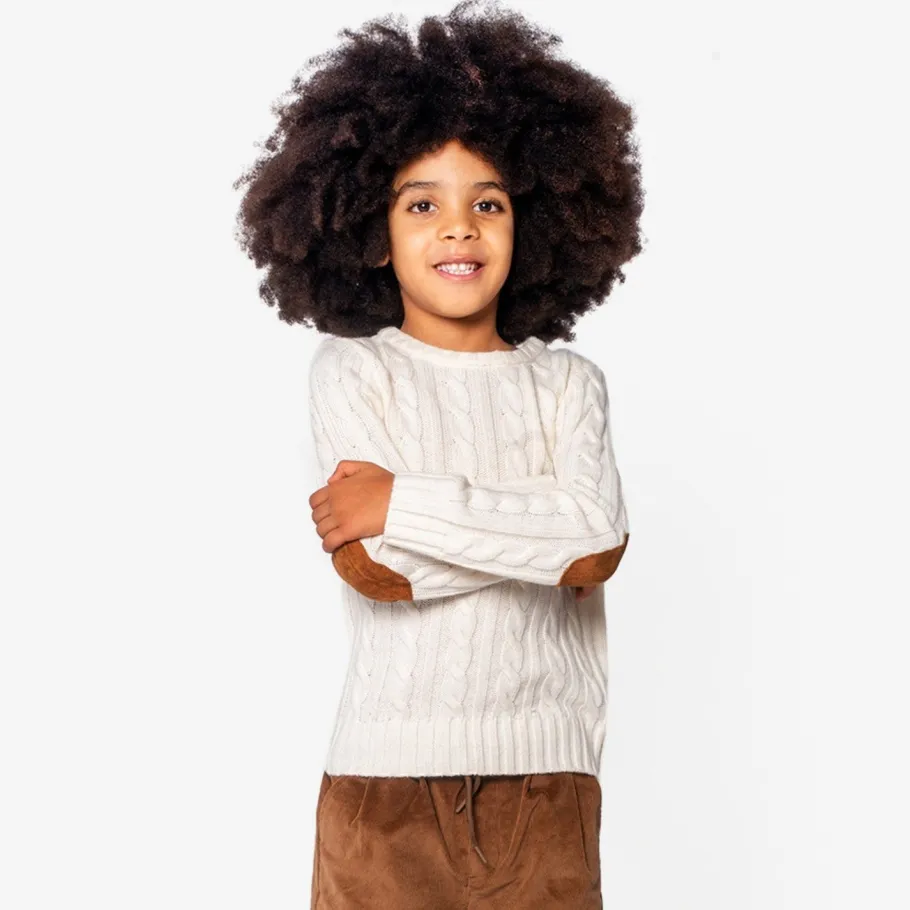 This Fisherman Sweater is a timeless piece for every young gentleman’s wardrobe. With its intricate cable knit design and distinguished brown elbow patches, this sweater exudes sophistication. Perfect for dinners or special events, it ensures a polished look that never goes out of style. Dress to impress with the Winter White Fisherman Sweater from Appaman.