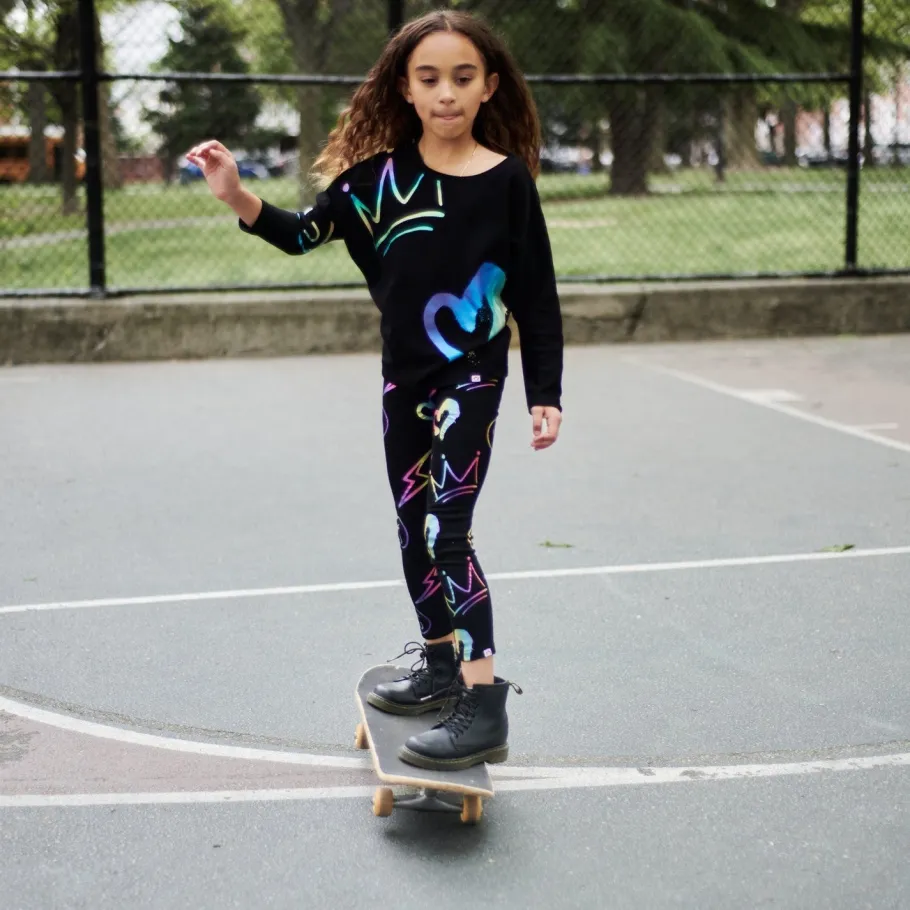 Our Graffiti Slouchy Sweatshirt in Black features sprays of hearts, smileys, and crowns for your happy little queen. Make it a matching set with our Graffiti leggings.