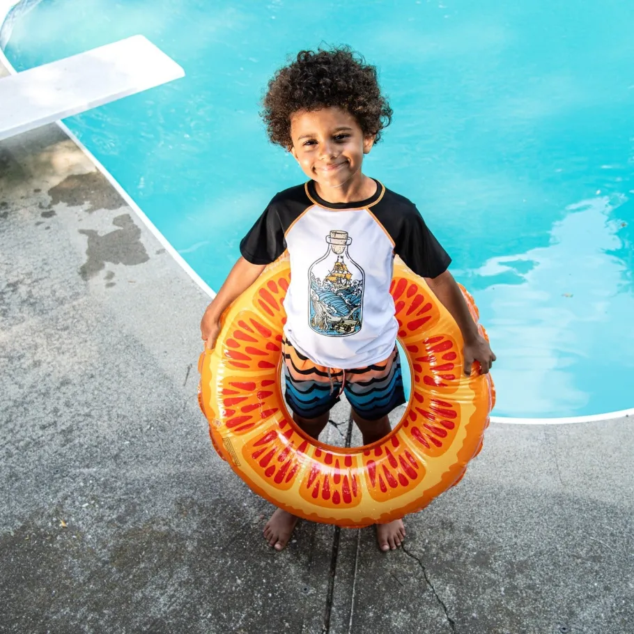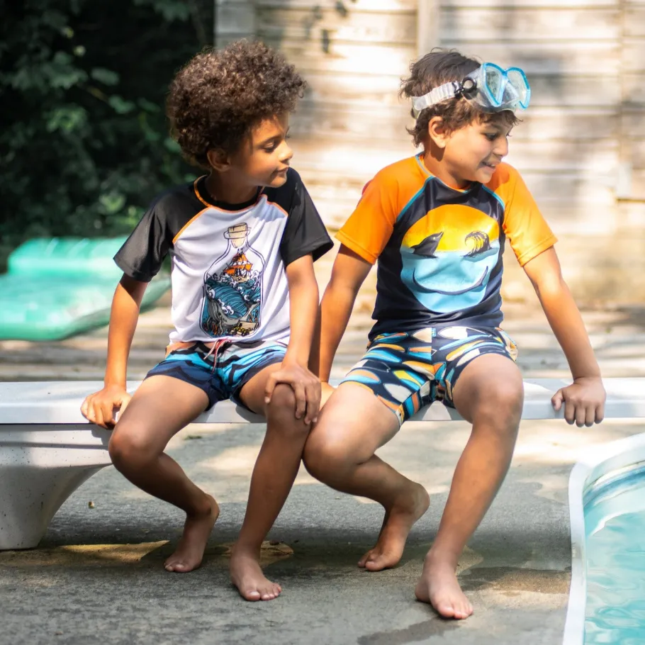 Colorful and wavy swim trunks for a day full of laughter and splash featuring an adjustable drawstring for the perfect fit. The fabric is chosen to keep kids safe from the harmful ray with SPF 50+.