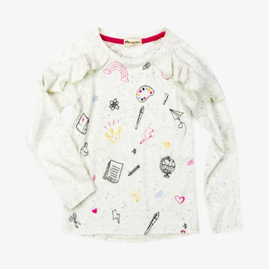 Explore the fun of going back to school with the fun, playful doodles that float around tee. This Amelie Tee will keep your kid stylish and their imagination running wild.